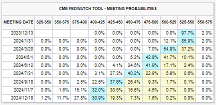 ADP报告为美国劳动力市场进一步放缓提供了重要证据,一定程度加深了市场预计美联储加息已结束并将在明年年中降息的预期。据CME“美联储观察”:美联储12月维持利率在5.25%-5.50%区间不变的概率为97.7%,加息25个基点的概率为2.3%。到明年2月维持利率不变的概率为85.9%,累计降息25个基点的概率为12.1%。市场还普遍预计美联储最早可能在明年年中开始降息,5月份与6月份降息的概率均超过40%。