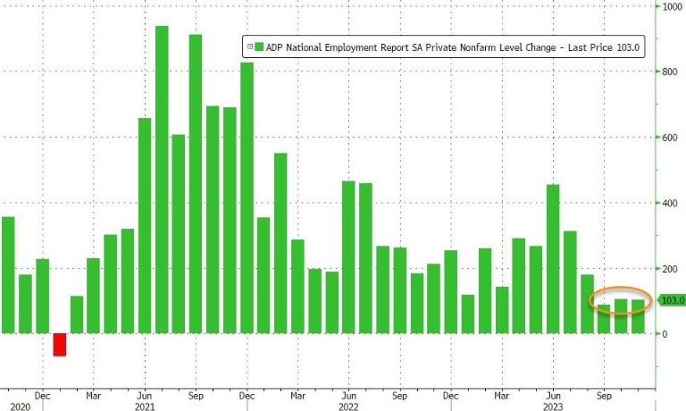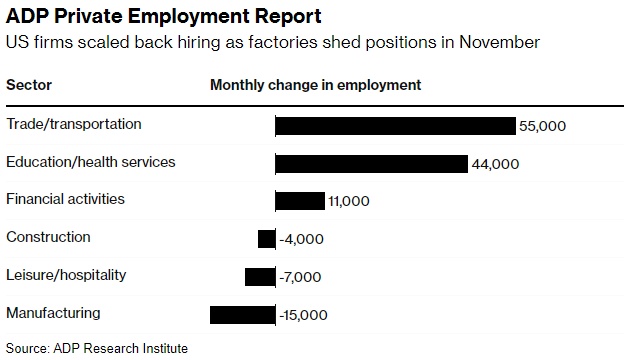 智通财经获悉,“小非农”美国11月ADP就业人数 10.3万人,预期13万人,前值11.3万人,为连续第四个月不及预期。上个月,招聘人数温和增长,薪资增速再次放缓。商品和服务业均出现疲软,休闲和酒店业以及制造业的就业岗位均出现下滑。