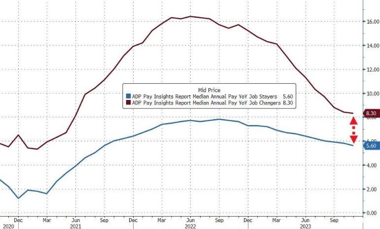 ADP数据显示,11月份就业人员的工资增长了5.6%,这是自2021年9月以来的最低薪资增长速度。换工作的人的工资增长也在放缓,薪资增幅为8.3%,是自2021年6月以来的最小同比增幅。换工作的溢价处于三年来的最低水平。