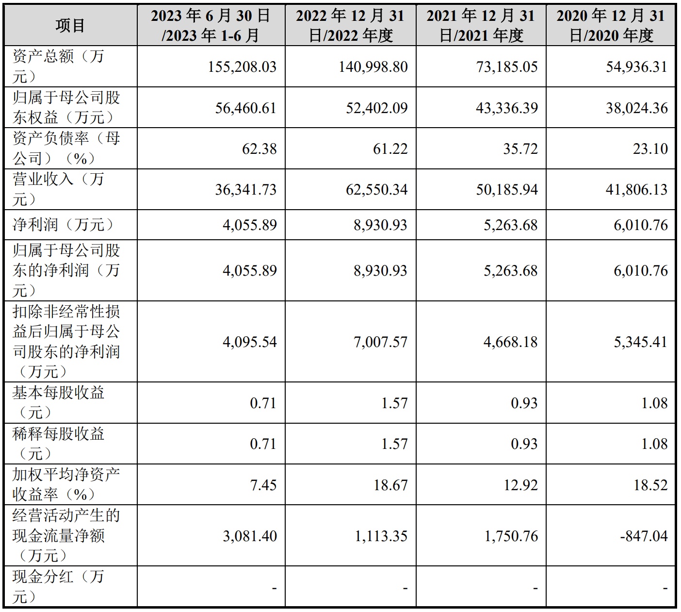 财务方面,于2020年度、2021年度、2022年度及2023年上半年,安培龙实现营业收入分别约为4.18亿元、5.02亿元、6.26亿元及3.63亿元人民币。同期,净利润分别约为6010.76万元、5263.68万元、8930.93万元及4055.89万元人民币。