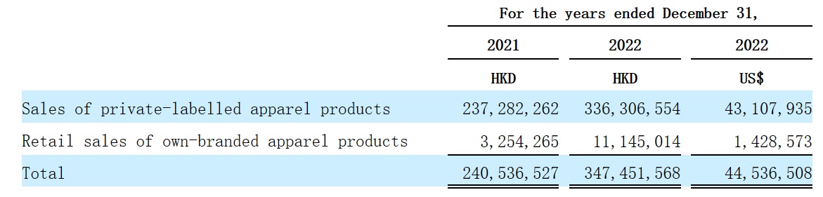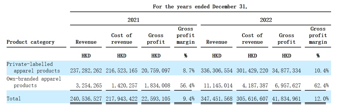 2022年时,得益于疫情后经济的复苏,思宏国际的业务发展随之回暖。公司报告期内的收入为3.47亿港元,同比大增44.4%。其中,自有标签服装产品的收入为3.36亿港元,同比增长41.77%;自有品牌服装产品的收入为1114.5万港元,同比大增242.5%,两大产品均实现高速增长,但自有标签服装产品收入占比为96.79%,仍是思宏国际的业务大头。