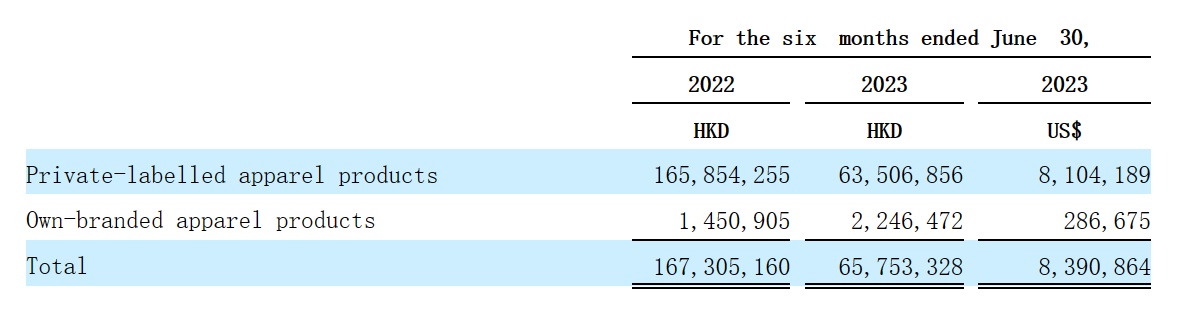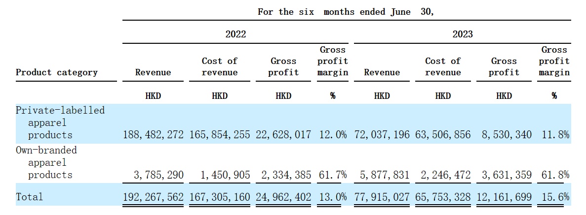 从上述对业绩的梳理中不难发现,思宏国际在经营自有标签服装产品的同时已开始加速发力高毛利的自有品牌产品,这使公司2022年的业绩随经济复苏展现出了较强的弹性。但至2023年上半年市场需求的下滑导致自有标签产品收入大幅下降,而自有品牌收入虽持续增长但因占比较小仍难挽颓势从而导致亏损。