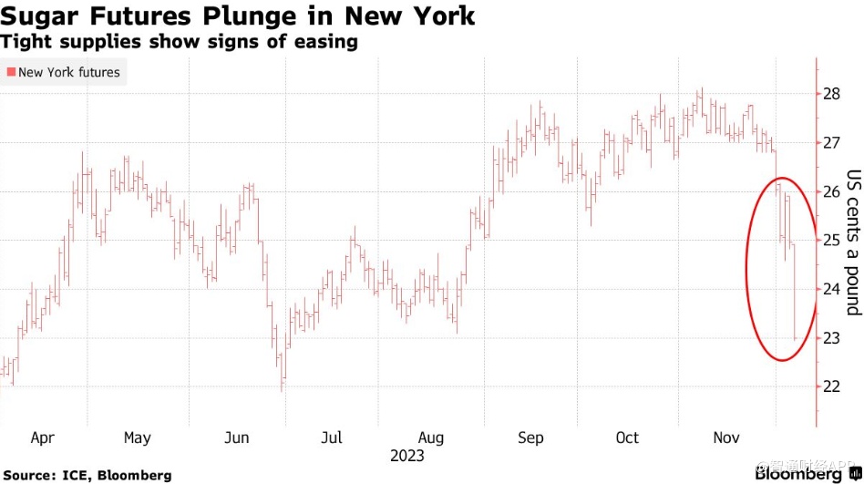 周四,印度糖业公司的股价暴跌。Balrampur Chini Mills Ltd.在孟买股市重挫7.6%,延续了前一日逾7%的跌幅。Shree Renuka Sugar Ltd.下跌5.5%,Bajaj Hindusthan Sugar Ltd.下跌7.4%。在此之前,纽约食糖期货周三暴跌近8%,创10个月来最大跌幅。