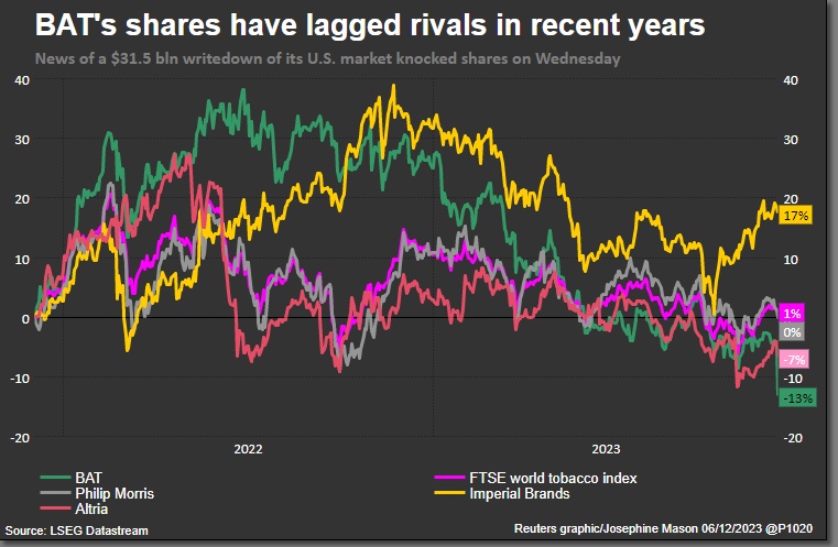 智通财经APP获悉,英美烟草(BTI.US)周三宣布,将在其美国香烟业务上进行高达315美元的减记,这是近期历史上规模最大的企业减记之一。据悉,英美烟草这笔高额的减记主要来源于该公司在2017年时斥资494亿美元收购雷诺兹烟草。受此消息影响,英美烟草周三美股收跌8.5%。