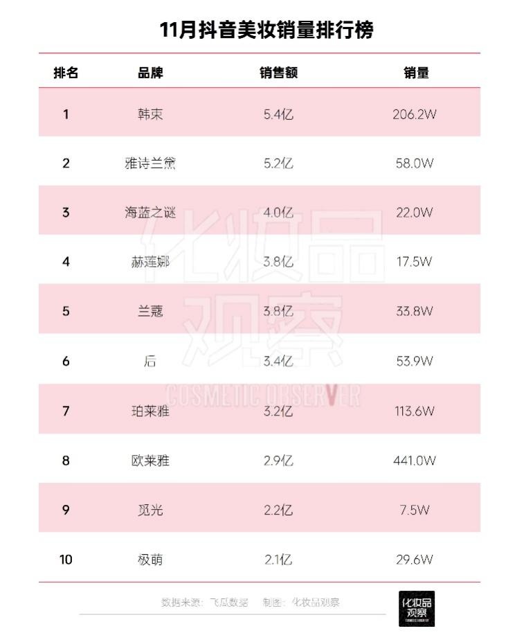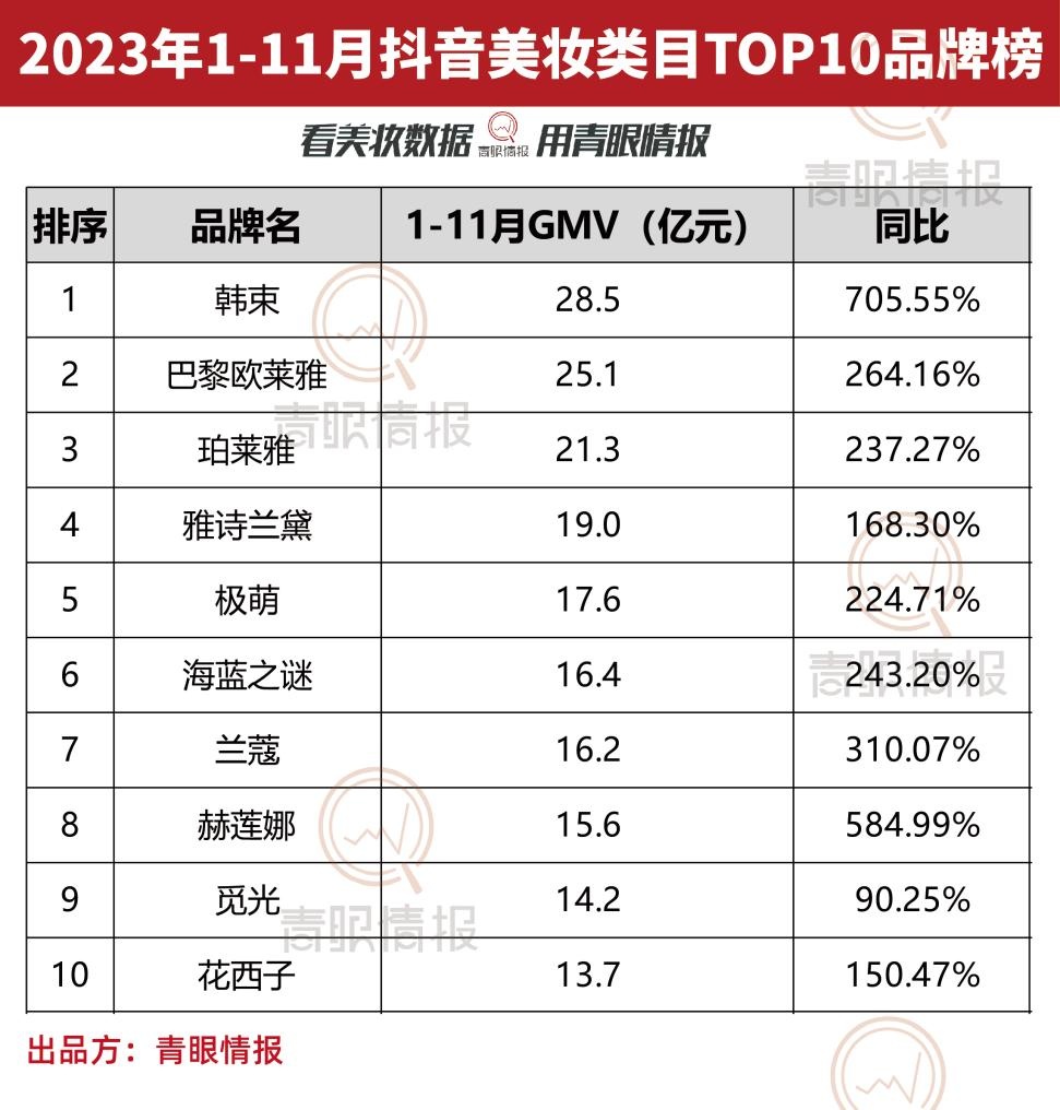 与此同时,据青眼情报,2023年1-11月韩束抖音累计GMV为28.5亿元,依然位居榜首,这也意味着韩束今年始终稳定在抖音美妆行业的第一阵营。