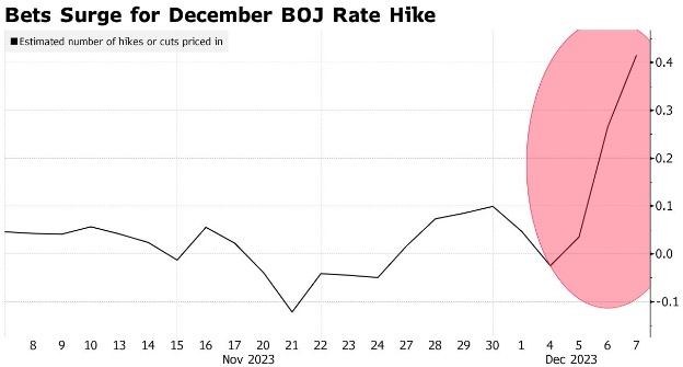 剩下的关键问题是什么时候会发生。日本央行将于12月18日至19日召开会议,1月份将举行另一次政策会议。明年工会薪资谈判结果出来后,将在3月和4月举行会议。