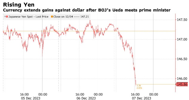 周四上午,日本央行行长植田和男在日本国会发言称,从年底到明年在货币政策的处理问题上将变得更具有难度,如果加息的话有多种选项可以用于调整政策利率。而就在植田和男发表这番言论的前一天,日本央行副行长冰见野良三暗示,加息可能越来越近,并淡化了对加息潜在负面影响的担忧。