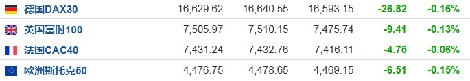 2.截至发稿,德国DAX指数跌0.16%,英国富时100指数跌0.13%,法国CAC40指数跌0.06%,欧洲斯托克50指数跌0.15%。
