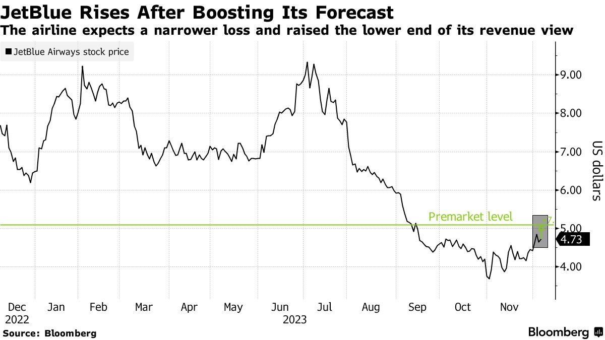 捷蓝航空周四在一份证券备案文件中表示,预计2023年调整后每股亏损40至50美分,营收增长4%至5%。该公司此前的预期为,2023年调整后每股亏损45至65美分,营收增长3%至5%。