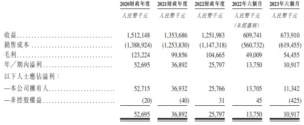 财务方面,于2020财年、2021财年以及2022财年以及2022年、2023年六个月,泛远国际控股收益分别为约15.12亿元、13.54亿元、12.52亿元、6.10亿元、6.74亿元人民币;同期,年/内溢利分别为5269.5万元、3689.2万元、2579.7万元、1375万元、1091.7万元人民币。