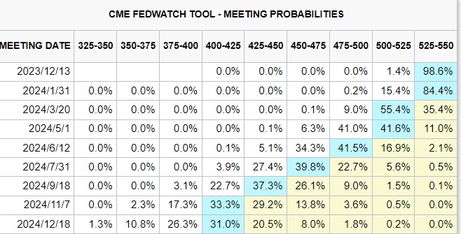 然而,目前市场预期美联储明年将至少降息高达1.25个百分点,这一趋势似乎为美债收益率下降和股票等风险资产持续上涨扫清了障碍。CME“美联储观察工具”显示,利率期货交易员们对于美联储明年降息的预期迅速升温。概率数据显示美联储明年3月份下调基准利率的可能性超过50%,并预计到2024年底,基准利率将降低至4%左右,该基准目前在5.25%至5.5%之间,这意味着市场预期明年降息幅度至少高达125个基点。