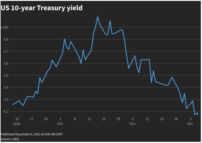 汇丰银行固定收益策略师预计2024年底美国10年期国债的收益率将从目前的4.3%左右降至3%。