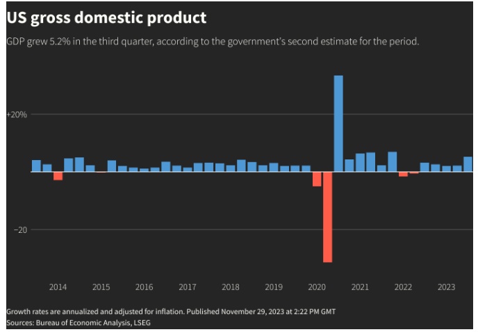 与一年前大多数预测美国将陷入衰退和快速降息但未实现的共识形成鲜明对比的是,如今这些预测者之间缺乏一致意见。今年第三季度,世界上最大的经济体美国的经济增长了5.2%。