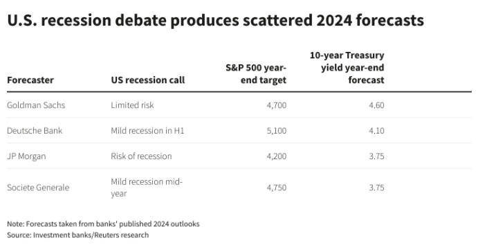 其中,德意志银行预测2024年上半年美国将出现轻微衰退,并降息175个基点,降低的借贷成本将推动标普500指数上涨至5100点。据了解,标普500指数今年上涨了19%,达到4567点。
