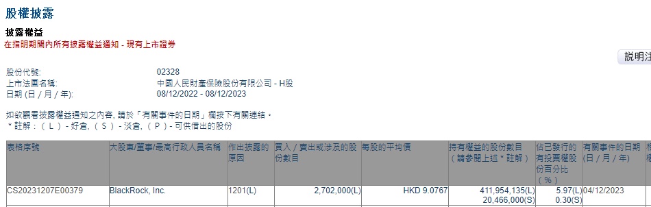 智通财经APP获悉,香港联交所最新资料显示,12月4日,贝莱德减持中国财险(02328)270.2万股,每股作价9.0767港元,总金额约为2452.52万港元。减持后最新持股数目约为4.12亿股,最新持股比例为5.97%。