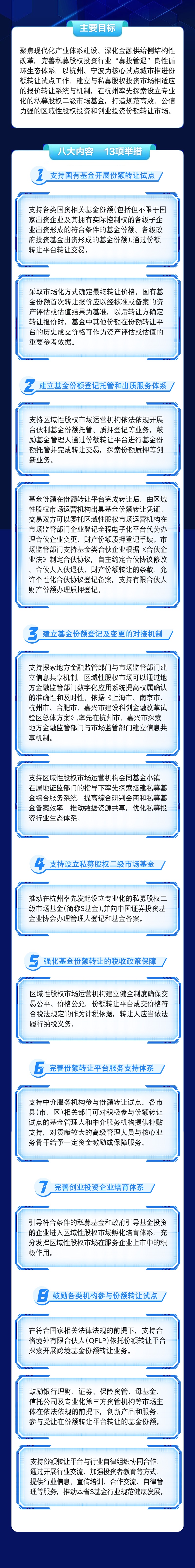 11月29日,浙江省地方金融监督管理局、中国证券监督管理委员会浙江监管局、浙江省财政厅、浙江省人民政府国有资产监督管理委员会、浙江省市场监督管理局、国家税务总局浙江省税务局六部门联合印发《关于推进股权投资和创业投资份额转让试点指导意见的通知》(简称:指导意见),指导意见共八项主要内容,13条具体举措,旨在推动我省股权投资和创业投资份额转让试点工作落地落实,促进金融资本与产业资本循环畅通,助力经济高质量发展。