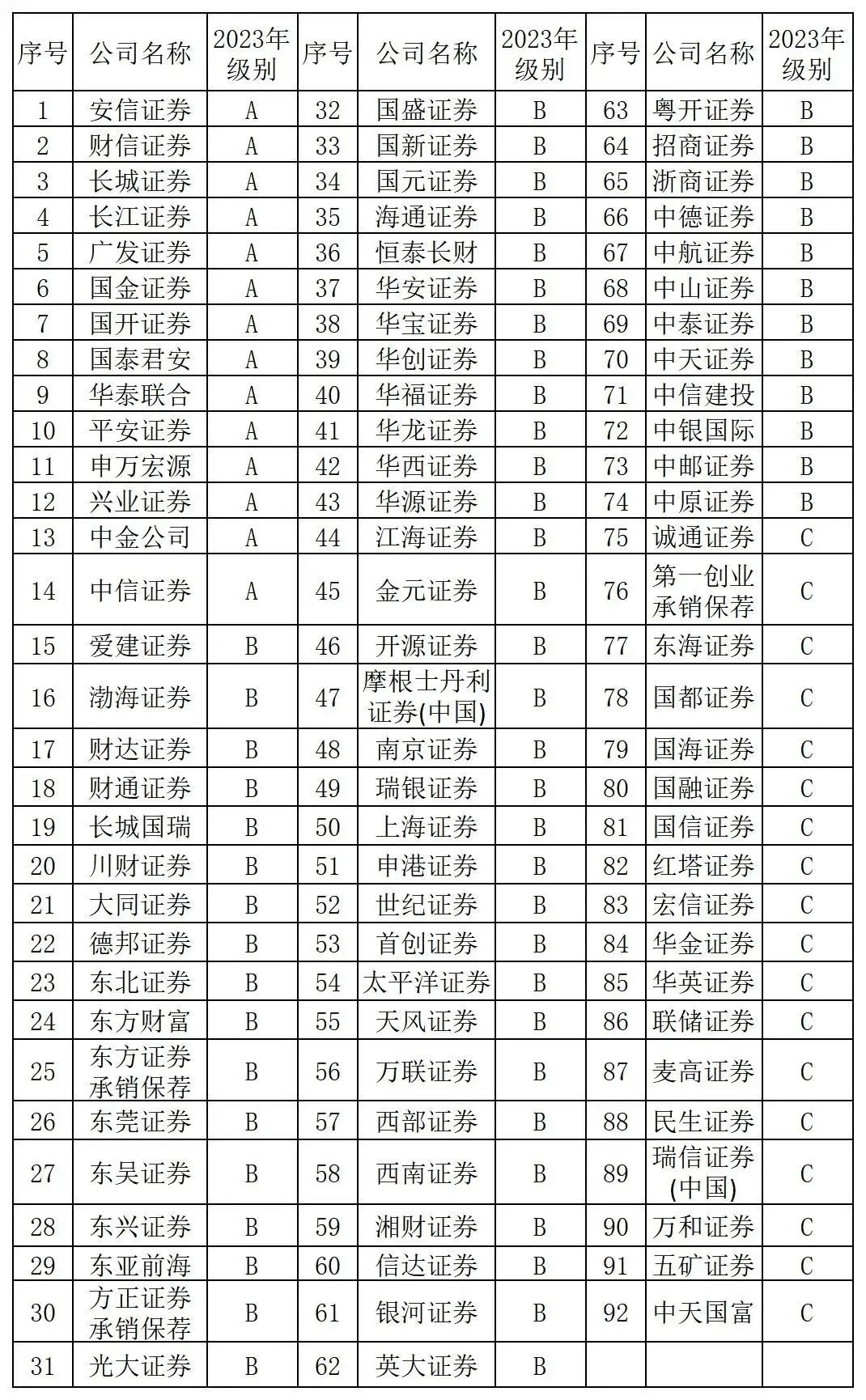 智通财经APP获悉,12月8日,中国证券业协会公布2023年证券公司债券业务执业质量评价结果,合计92家证券公司参评,14家获A类评价,60家获B类,18家获C类。中证协称,执业质量评价是激励约束证券公司提升债券承销与受托管理执业水平的重要方式。下一步,协会将在监管部门指导下促进证券公司更好发挥“看门人”作用,推动债券市场高质量发展。