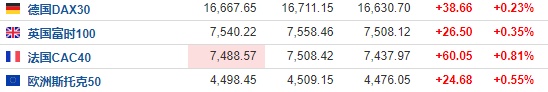 2.截至发稿,德国DAX指数涨0.23%,英国富时100指数涨0.35%,法国CAC40指数涨0.81%,欧洲斯托克50指数涨0.55%。