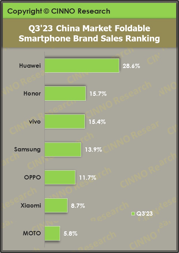 从市场份额来看,2023年第三季度,华为位居国内市场份额No.1,主要得益于Mate X3/ Pocket S良好的市场表现及Mate X5系列的上市;荣耀则位居第二,Top7品牌销量增长最大,主要得益于其7月上市的Magic V2;vivo排名国内第三,其首款竖折产品X Flip市场表现良好;三星/OPPO市场份额则分列四、五位。