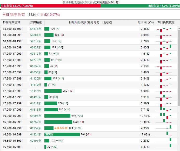 法兴恒指牛熊证街货分布图中的数据显示,熊证街货重货区在16600-16699区间,该区间最新熊证数量为741张,较上一交易日减少81张;最多新增在16700-16799区间,该区间最新熊证数量为194张,较上一交易日增加170张。