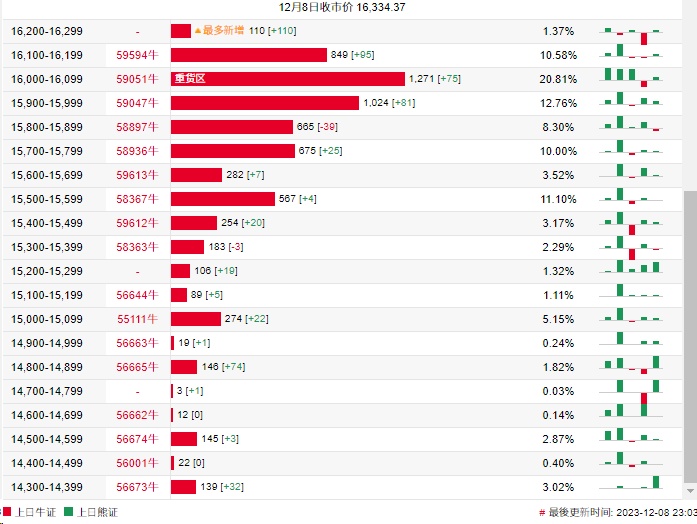 牛证街货重货区在16000-16099区间,该区间最新牛证数量为1271张,较上一交易日增加75张;最多新增在16200-16299区间,该区间最新牛证数量为110张,较上一交易日增加110张。