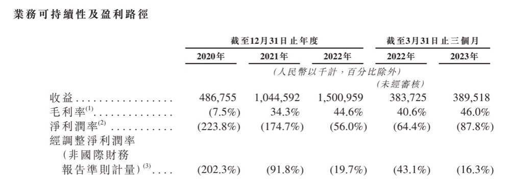 期间内,公司毛利率同比快速提升,由2020年的毛损率7.5%转正为2021年的毛利率34.3%,并上升至2022年的44.6%,截至2023年3月31日止三个月达到46.0%。然而,反映到Bottom Line上,2020-2022年至2023年一季度,公司净利润却分别亏损约10.9亿元、18.2亿元、8.4亿元和3.4亿元,期内共计亏损约41亿元。
