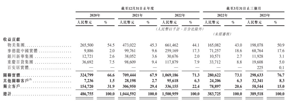 与此同时,如多点数智在招股书中风险提示部分提到,公司非常依赖关联实体(即物美集团、重庆百货集团、银川新华集团、麦德龙中国实体及百安居实体)。2020-2022年至2023年一季度,来自关联实体的营收占比分别为66.6%、67.9%、71.3%及76.7%,比例逐年增加。