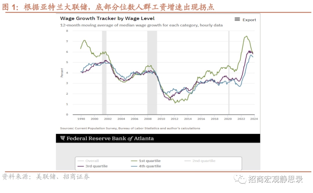 11月时薪增速环比小幅反弹至0.4%(前值0.2%),时薪同比在3.96%(前值4.04%)。本期时薪增速部分反映出罢工活动涨薪协议的影响,例如汽车业通用和福特等企业临时协议涨薪25%,Kaiser Permanente医疗系统也达成薪资上涨和福利补贴的初步协议。但整体而言,随着罢工潮活动结束,亚特兰大联储数据反映中低分位数人群的工资增速已现拐点,高分位数人群工资增速从23年来持续放缓,整体上工资-通胀螺旋的风险有限。