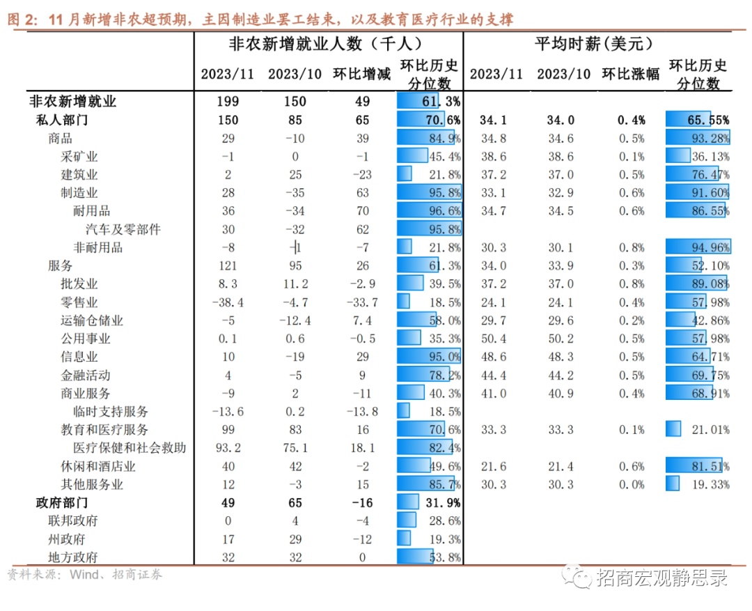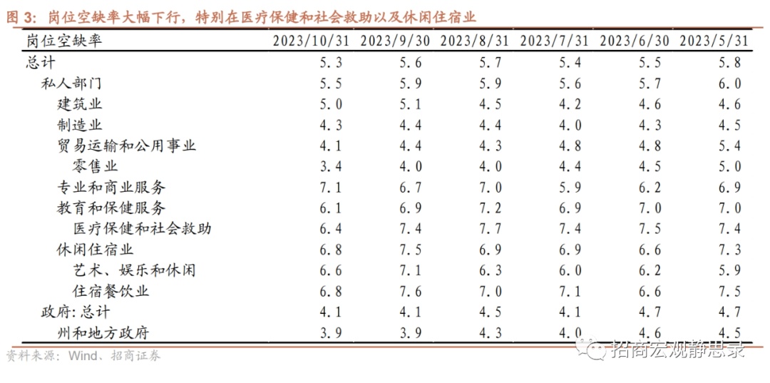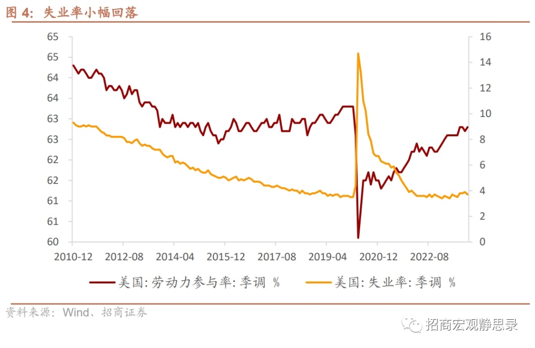 11月美国新增非农数据小幅超预期,主因罢工潮结束后制造业劳动者返回工作岗位;而劳动参与率和职位空缺率仍反映出劳动力市场的供需在持续均衡,短期事件扰动对美联储的影响有限。1)11月非农新增19.9万人,稍高于市场所预期的18.5万人。根据BLS,制造业新增2.8万人,主因全美汽车工人联合会(UAW)罢工结束后劳动者返回岗位,此次罢工事件扰动亦曾致使10月新增非农数据低于预期。2)教育和医疗服务行业的非农新增提速至9.9万人(前值8.3万人),政府部门新增4.9万人(前值6.5万人),合计对整体新增非农的拉动占比达到74%。休闲和酒店业11月新增4万人(前值4.2万人),时薪环比0.6%,量、价均偏强,反映出服务业消费动能仍有一定惯性。零售业降温明显,就业减少3.8万人(前值减少0.5万人)。3)尽管存在短期扰动,美国的劳动力市场需求侧仍在持续降温。根据12月5日发布的JOLTS数据,10月职位空缺率大幅下行至5.3%(前值5.6%),其中医疗保健和社会救助明显降温,预计医疗行业后续对新增非农的支撑会减弱。本期对前月数据有小幅下修,主要体现在9月非农新增从初值的33.6万人,再度下修至26.2万人。劳动参与率本月上升至62.8%,相较疫情前63.3%的水平,在移民劳动者回归常态化的支持下,劳动力市场的供需均衡调整仍有空间。4)随着劳动参与率上升至62.8%,11月失业率回落至3.7%,经济软着陆的前景仍在。