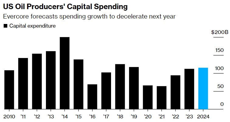 智通财经获悉,美国石油生产商即将放慢资本支出的增长速度,这表明,在美国石油产量今年升至创纪录水平之后,页岩油产量的增长速度可能会放缓。根据Evercore ISI的数据,到2024年,钻井公司的资本支出将仅增加2%,而今年的增幅为19%。