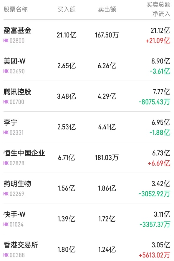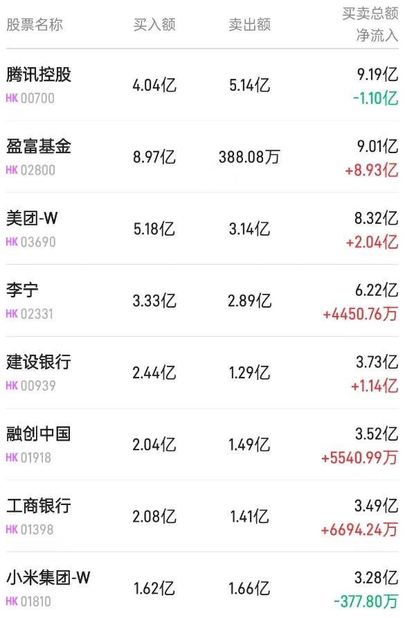 北水净买入最多的个股是盈富基金(02800)、恒生中国企业(02828)、建设银行(00939)。北水净卖出最多的个股是腾讯(00700)、李宁(02331)。