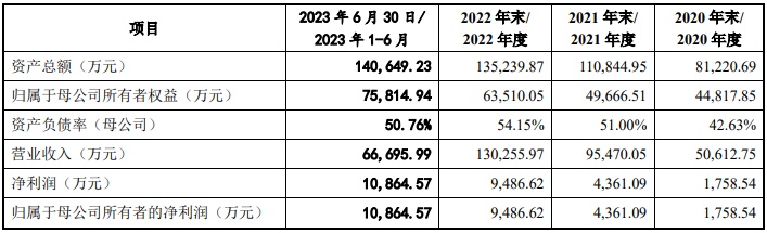 财务方面,于2020年度、2021年度、2022年度、2023年6月30日,公司实现营业收入分别为5.06亿元、9.55亿元、13.03亿元、6.67亿元,同期,公司实现净利润分别为1758.54万元、4361.09万元、9486.62万元、10864.57万元。