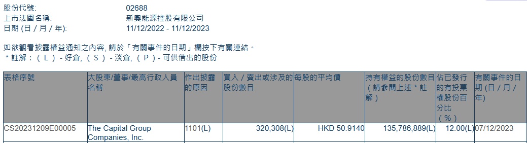 智通财经APP获悉,香港联交所最新资料显示,12月7日,美国资本集团增持新奥能源(02688)32.0308万股,每股作价50.9140港元,总金额约为1630.82万港元。增持后最新持股数目约为1.36亿股,最新持股比例为12.00%。