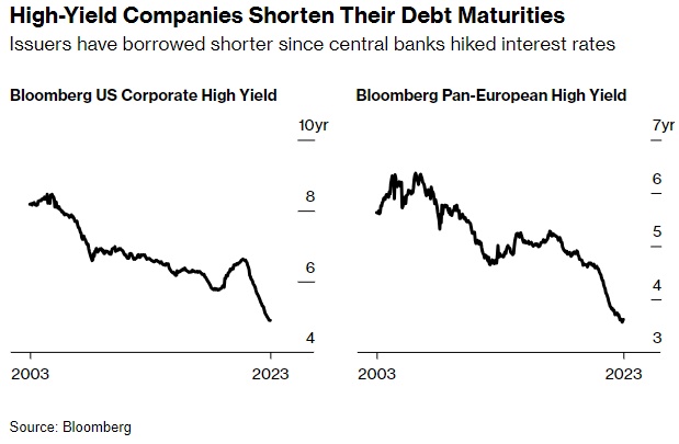 评级低于投资级的公司尤其容易受到冲击,它们的债务期限在加息周期中大幅缩短——在美国不到5年,在欧元区不到4年。