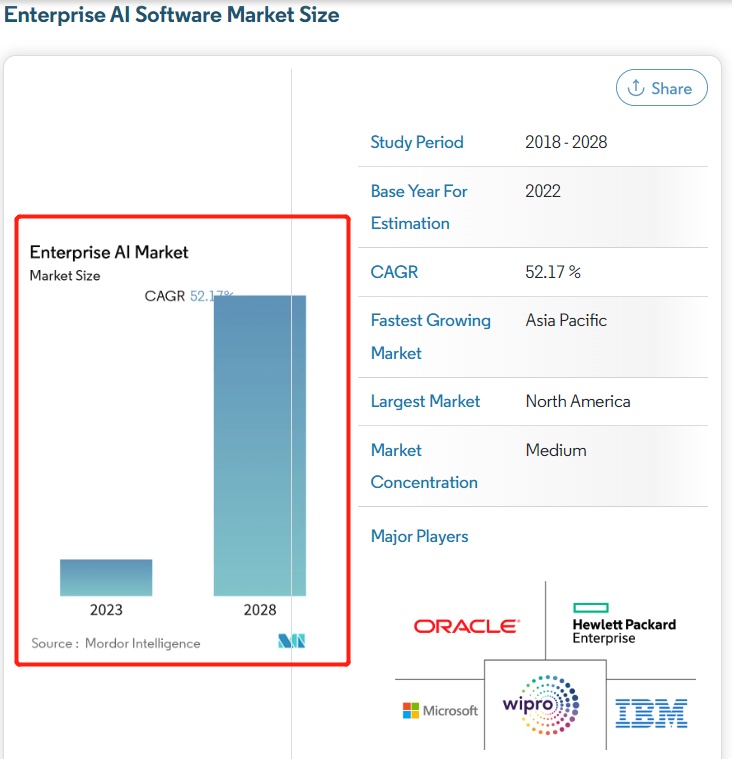 企业AI应用端预期方面,Mordor Intelligence研究报告显示,预计到2028年,企业人工智能市场的总规模将以每年52%的速度快速增长。Mordor Intelligence指出,全球企业逐渐认识到将人工智能融入其业务流程、通过AI自动化流程提高经营效率并降低成本的价值。Mordor Intelligence强调,最重要的是,AI未来将能够帮助全球企业预测业务成果,提高企业盈利能力。