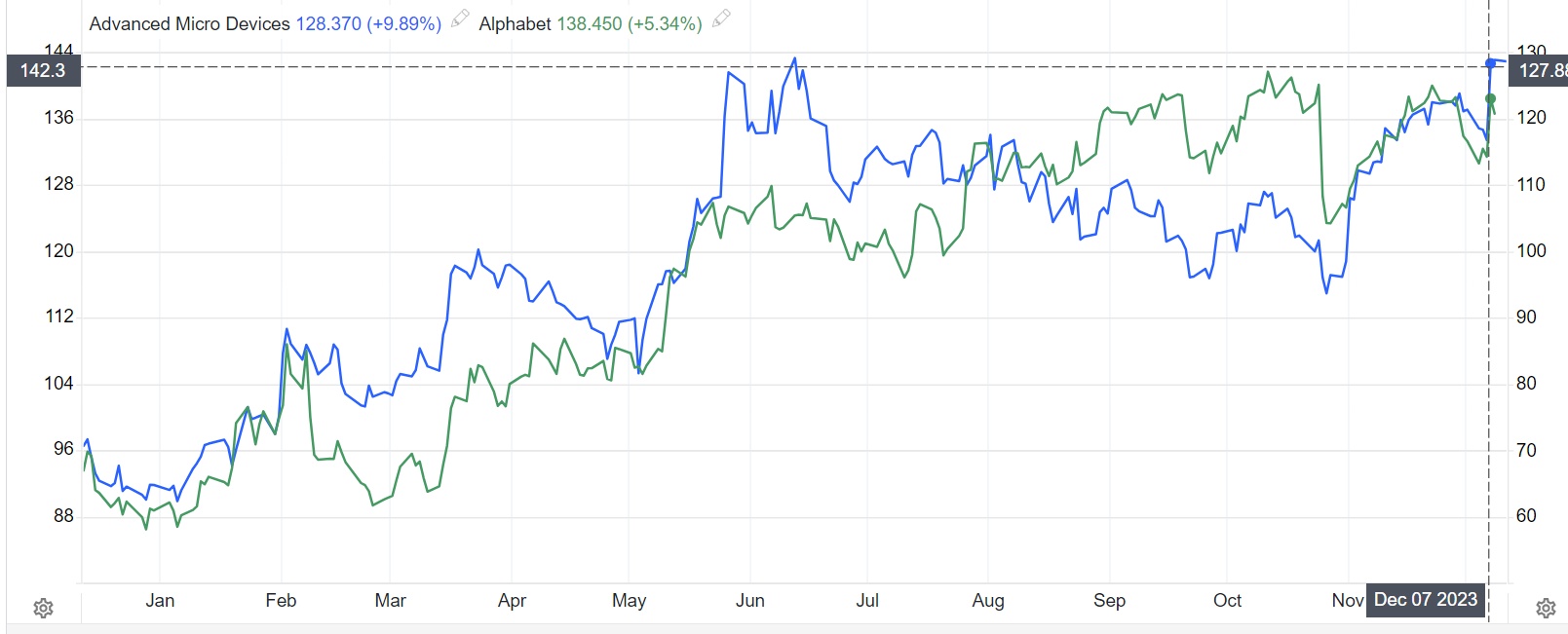 随着AMD(AMD.US)发布号称“最强算力”的AI芯片Instinct MI300X,谷歌(GOOGL.US)发布该公司史上“规模最大、能力最强”的AI多模态大模型Gemini等重磅消息陆续轰炸市场,科技股投资者们对于AI的信仰在全球股市再度掀起巨大波浪。放眼全球股市,与AI相关的热门科技股股价全线暴涨。展望未来,像AMD这样惊艳全球的“AI后进者”也许将越来越多。