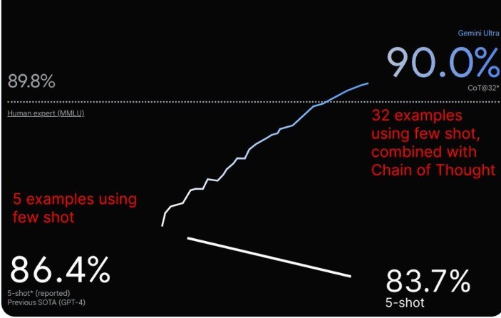 但是,随着谷歌发布迄今为止“规模最大、能力最强的”的AI模型Gemini,似乎谷歌在AI领域的发展形势瞬间好转。谷歌在多种任务上评估了两种模型的性能,惊喜地发现:从自然图像、音频、视频理解到数学推理,Gemini Ultra在32个常用的学术基准的30个上,已经全面超越GPT-4。而在MMLU(大规模多任务语言理解)测试中,Gemini Ultra以90.0%的高分,首次超过人类专家。
