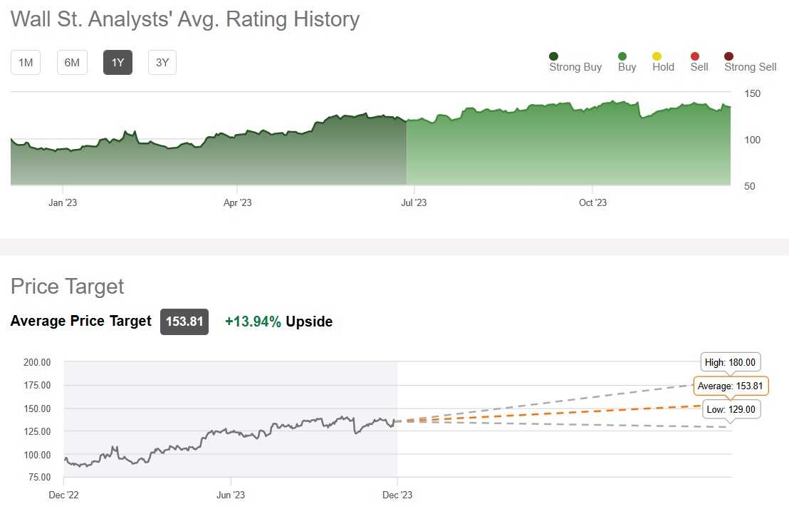 股票评级和股价预期方面,投资研究平台Seeking Alpha汇编的预期数据显示,华尔街分析师们予以谷歌的共识评级为“买入”,平均目标价达153.81美元,意味着未来12个月潜在上行空间达13%,如果达到这一平均点位,谷歌股价也将顺势创下历史新高。