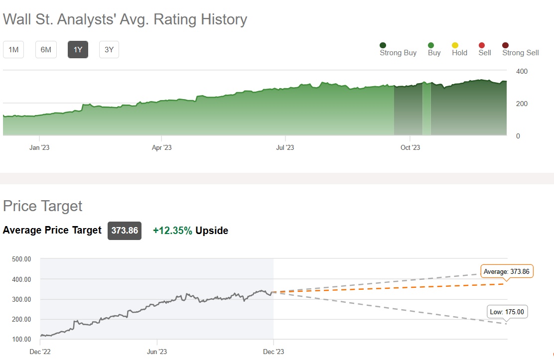 在不少分析师看来,Meta核心业务——广告业务已经重新恢复增长趋势。因此,在全新生成式AI技术加持下,Meta广告业务规模有望继续扩张。股票评级和股价预期方面, Seeking Alpha汇编的预期数据显示,华尔街分析师们予以Meta的共识评级为“买入”,平均目标价达373.86美元,意味着未来12个月潜在上行空间达12%。