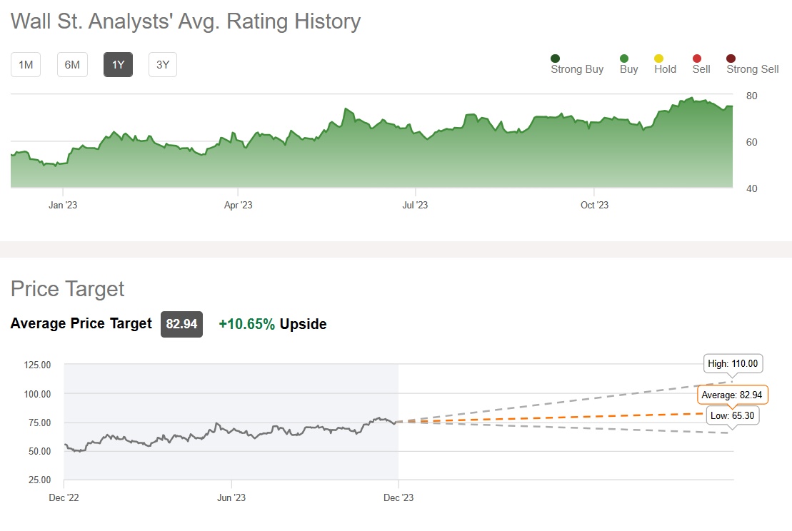 花旗表示,看好芯片行业全面复苏趋势,并将美光列为芯片行业首选股。花旗将该机构对美光的目标股价从85美元上调至88美元,维持“买入”评级。Seeking Alpha汇编的数据显示,华尔街分析师们予以美光的共识评级为“买入”,平均目标价达82.94美元,意味着未来12个月潜在上行空间达10%。