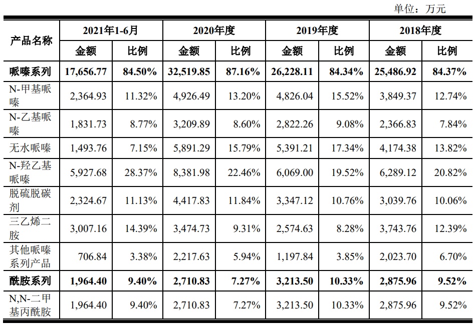 招股书披露,兴欣新材主要从事有机胺类精细化学品的研发、生产和销售,产品包括哌嗪系列、酰胺系列等,其中哌嗪系列产品为报告期内主要产品,占各期主营业务收入的85%左右,主要覆盖电子化学品、环保化学品、高分子材料、医药等应用领域。