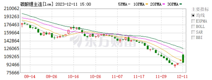 智通财经APP获悉,12月11日,碳酸锂期货早盘高开后迅速回落,截至收盘,碳酸锂期货跌幅近5%,跌破10万元/吨关口。此前,11月24日至12月5日的8个交易日中,碳酸锂2401主力合约持续下跌,多日触及跌停价。12月7日碳酸锂期货合约全线涨停,这也是自碳酸锂期货挂牌上市以来第二次全线涨停,12月8日连续涨停,重回10万元/吨关口之上,而仅隔周末,碳酸锂期货又跌破10万元/吨。