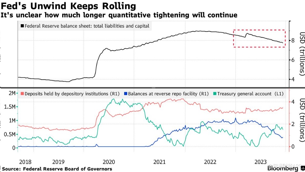 在过去18个月里,美联储每个月都让最多600亿美元的美国国债和最多350亿美元的机构债到期。Wrightson ICAP的经济学家Lou Crandall表示,更为谨慎的做法可能导致美联储在明年6月会议后放慢量化紧缩(QT)步伐,然后在2024年第三季度将美国国债月度削减上限降至300亿美元。他预计,抵押支持证券(MBS)的剥离将暂时以目前的速度继续下去。