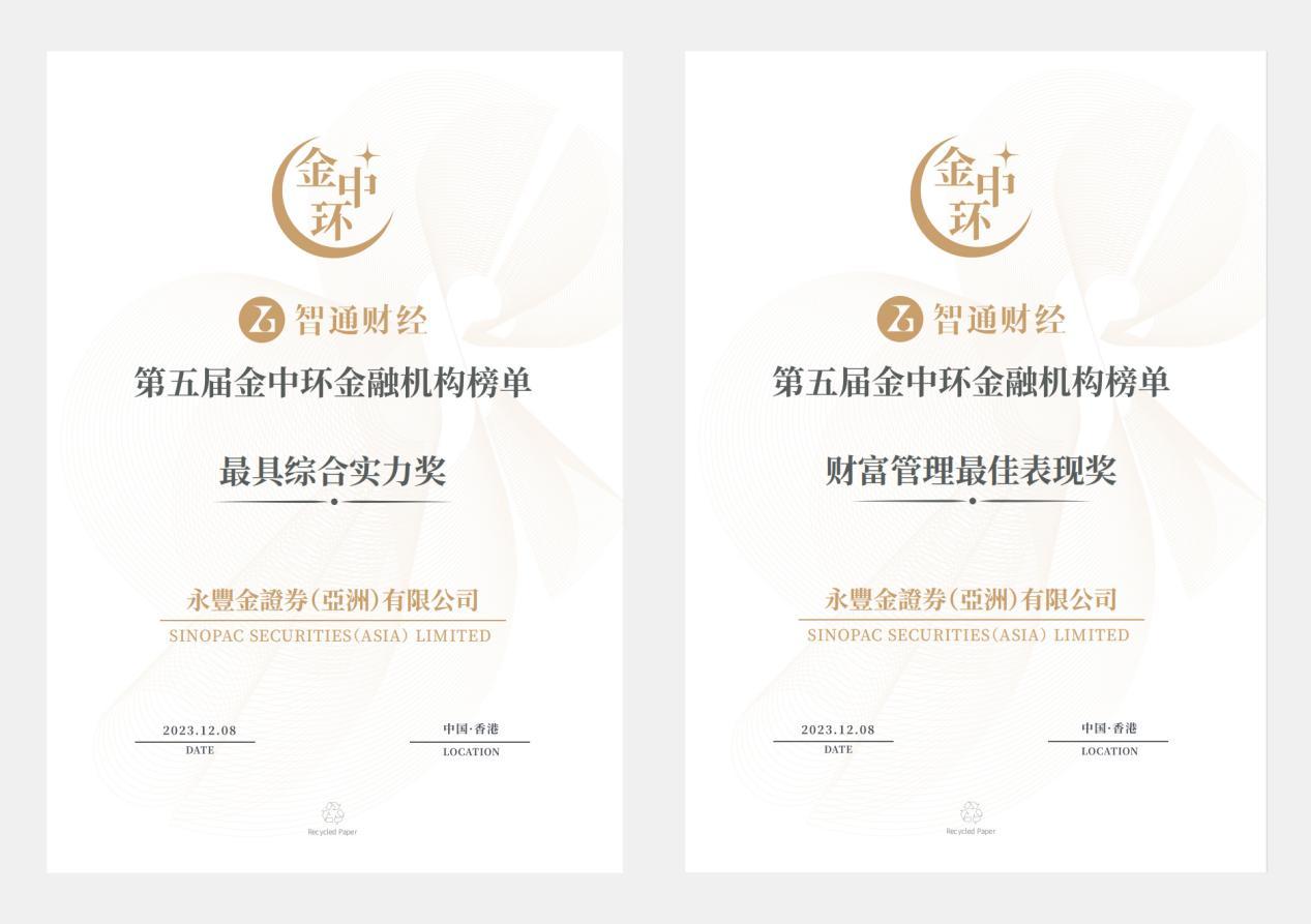 智通财经APP获悉,12月8日下午,第五届“2023·金中环论坛 ·洞察价值新征程”在香港中环举行,本次大会由全球领先的港美股资讯平台智通财经与久期财经、香港中资证券业协会联合主办。其中,永丰金证券(亚洲)从众多参评机构中脱颖而出,获颁“财富管理最佳表现奖”及“最具综合实力奖”。