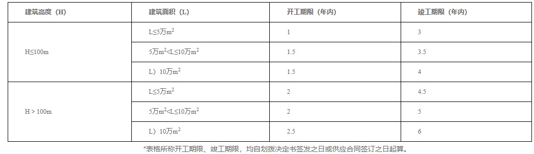 第四条 根据项目用地性质、建筑高度和建筑规模的不同,对建设用地的开工、竣工期限作如下规定。