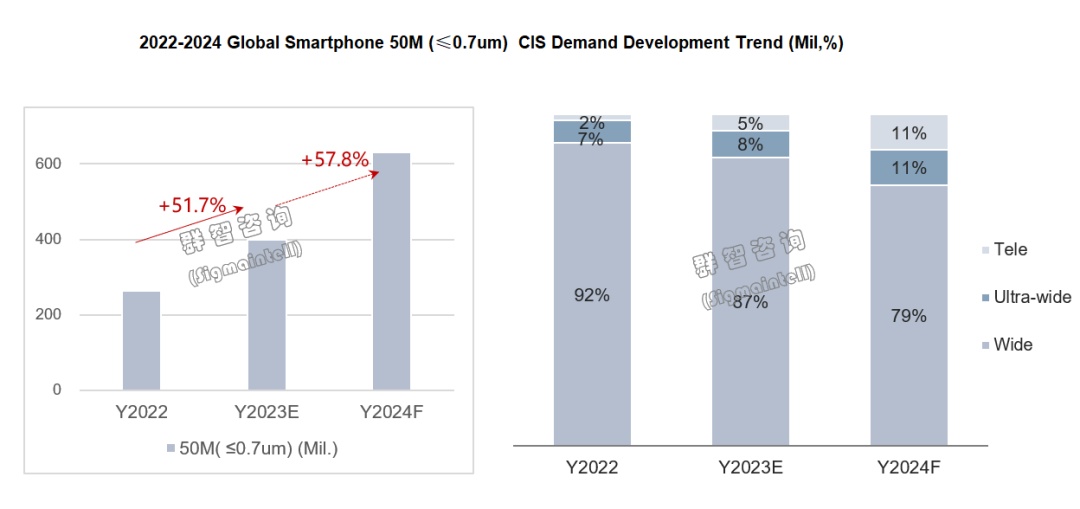 需求端:2023年由于低端机型的零部件成本整体下降,为影像模块升级提供了更大空间。根据群智咨询(Sigmaintell)的数据统计,低端机型的主摄像头规格正在逐步升级,从原来的13M/16M等规格上升至50M(≤0.7um),并且这一趋势在2024年有望继续上升,预计50M(≤0.7um)的需求量将超过6亿颗,同比增长约57.8%。