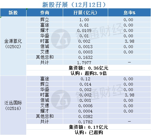 智通财经APP获悉,金源氢化(02502)、泛远国际(02516)正在招股中。截至12月12日,富途、辉立等券商合计为金源氢化借出孖展1.7977亿港元,超购逾3.9倍;合计为泛远国际借出孖展0.1782亿港元,已超购。