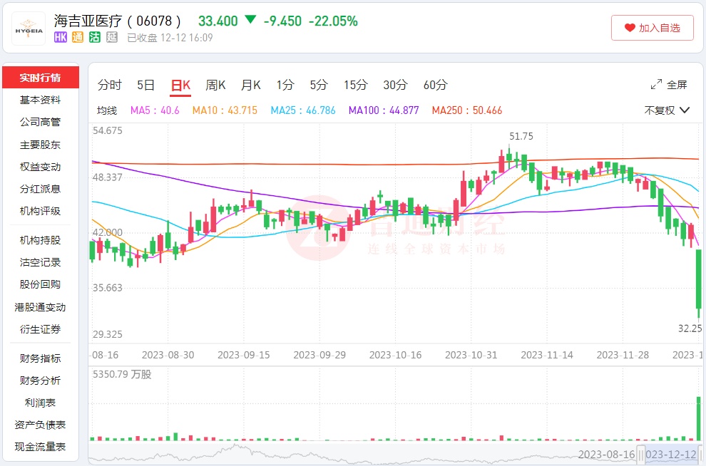 12月12日,海吉亚医疗逆市低开近6.7%,随后盘中急挫,一度跌超25%,创年内新低。截至当日收盘,其股价大跌22.05%报于33.4港元,最新总市值为210.93亿港元,成为当日港股市场跌幅居前的医疗概念股。