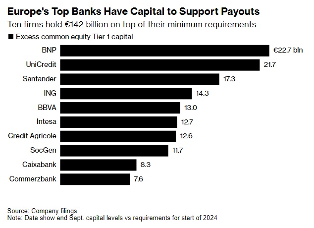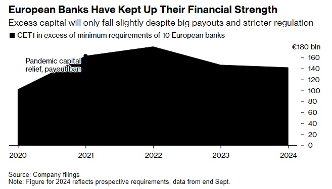 数据显示,已披露明年需要为监管目的保留多少资金的10家大型银行目前有1418亿欧元(合1530亿美元)超出了缓冲资本门槛。相比之下,去年这一数字为1465亿欧元(此后,这些银行向股东支付了数十亿欧元)。