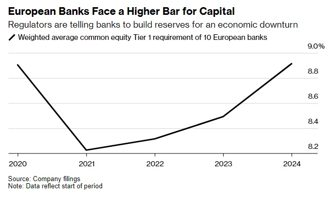 这10家银行披露的信息显示,各国监管机构正要求这些银行增加逆周期资本缓冲,为日益恶化的经济做准备。欧洲央行进一步提高了其认为存在缺陷的个别银行的监管门槛。总体而言,这些银行的平均资本要求已升至疫情前的水平。